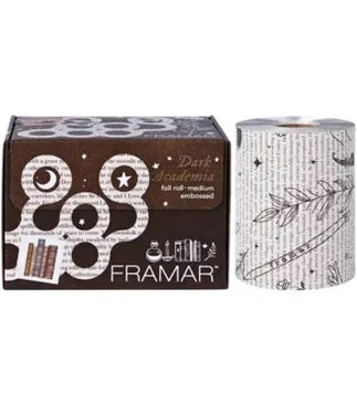 Framar Dark Academia Embossed Roll features rainy day journal entries straight from Framar’s archives that can be cut to any length.
