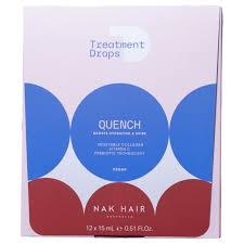 NAK Hair Treatment Drops - Quench works to hydrate and replenish dehydrated and frizzy hair strands after chemical services and color change. It restores hair softness and moisture balance with Vegetable Collagen, Ascorbic Acid, and Pre-Biotic technology. The treatments quenches sensitized hair for optimal care and beautiful styling.